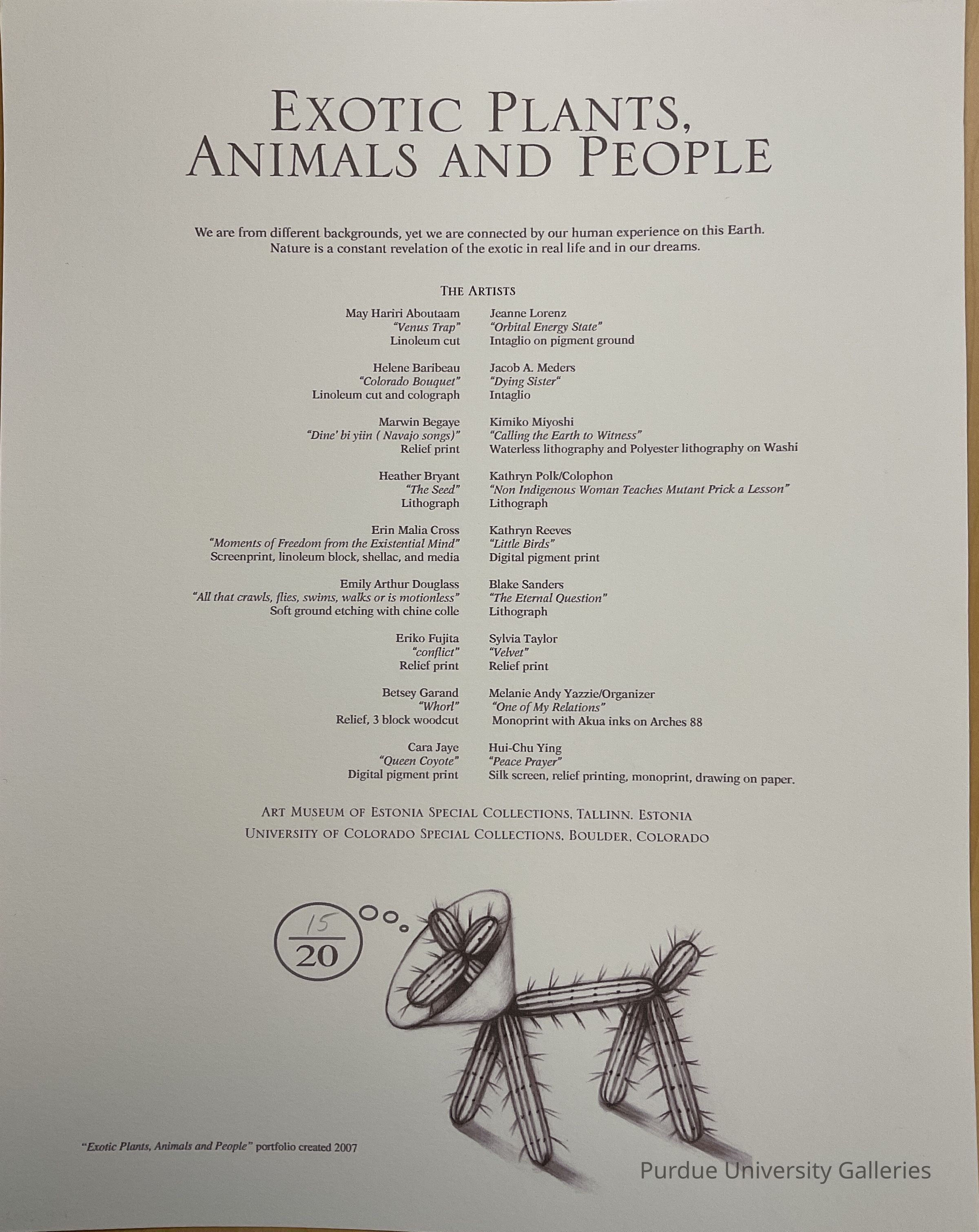 Broadside describing contents of print exhibit entitled "Exotic Plants, Animals and People." List of artists is in middle half and includes Aboutaam, Lorenz, Baribeau, Meders, Begaye, Miyoshi, Bryant, Polk (colophon), Cross, Reeves, Douglass, Sanders, Fujinta, Taylor, Garand, Yazzie (organizer), Jaye, Ying. Bottom 1/4 or page has a catctus in shape of a dog wearing a "cone of shame" and a thought bubble containing "15/20".