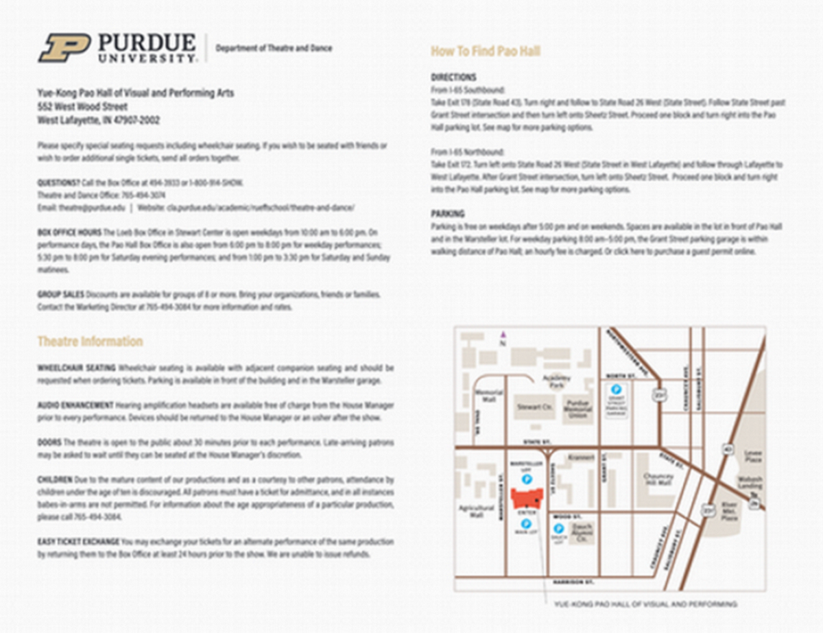 The Department of Theatre and Dance is located in Yue-Kong Pao Hall of Visual and Performing Arts. Located at 552 W. Wood Street, you can find Pao Hall between the Agriculture Mall/Marstellar Street and Hawkins Residence Hall/Sheetz Street on the south side of campus.Visitor Parking