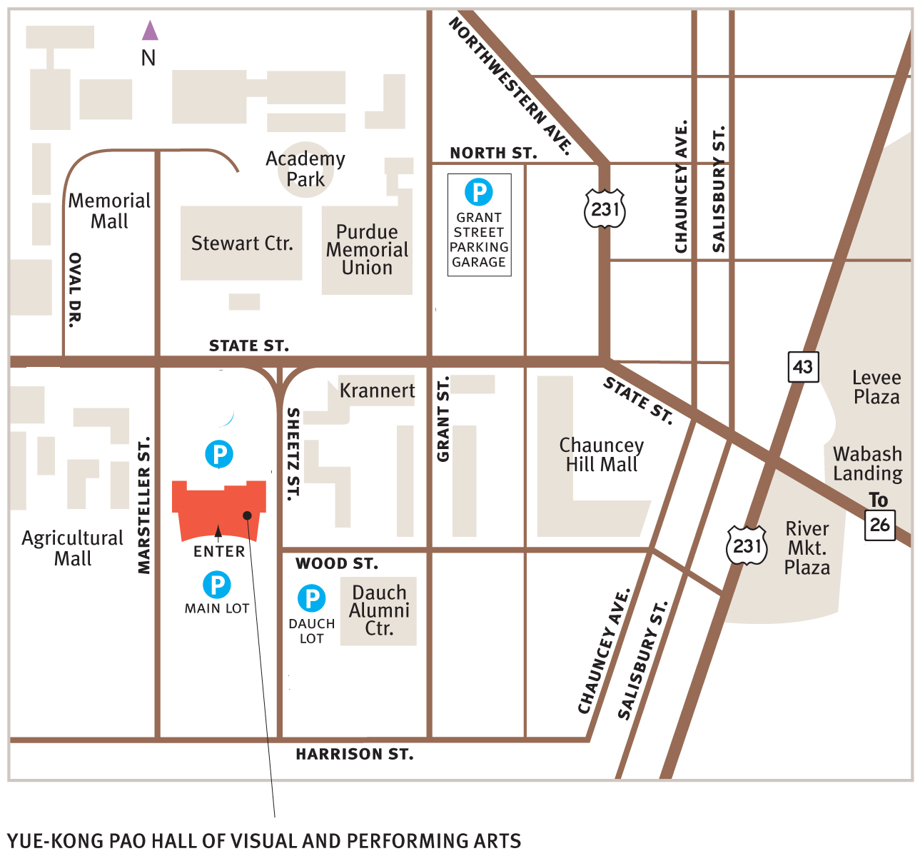 Take exit 178 (State Road 43). Turn right and follow to State Road 26 West (Mitch Daniels Boulevard). Follow Mitch Daniels Boulevard past the Grant Street intersection and turn left onto Sheetz Street. Proceed one block and turn right into the Pao Hall parking lot. See map for more parking options.