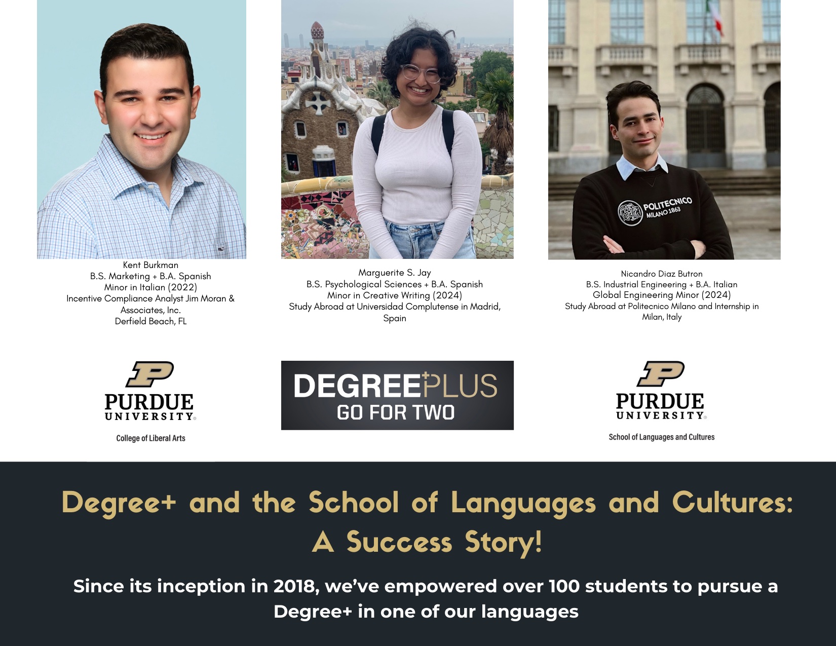 The Degree Plus program enables students to earn two bachelor's degrees in four years—one from CLA and another from a different Purdue college—without extending their time or tuition costs. By waiving the CLA core curriculum, Degree Plus students can seamlessly integrate a world language and culture education with disciplines like business, science, or technology. This dual-degree pathway enhances critical thinking, creativity, and communication skills, making graduates more marketable and competitive in diverse career fields.​