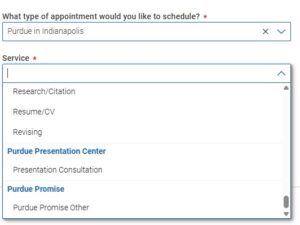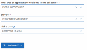 Purdue-Indianapolis students should use the following instructions for scheduling an appointment with the Purdue Presentation Center.