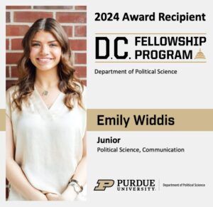 Emily Widdis is a junior double-majoring in political science and communication with a focus on international relations, public relations & strategic communication, and business communication, with a minor in Law & Society and is pursuing a certificate in public policy. She was previously an executive board member of Alpha Chi Omega, serving as the Director of Diversity, Equity, and Inclusion. Emily has interned for a national congressional campaign in 2020 and in 2023 she was appointed director of communication for a local city council campaign. She was invited to represent Purdue University at the 2023 Ohio State University National Security Simulation in which she engaged in diplomatic activities and international relations with the U.S. Department of State. In Spring 2024, Emily accepted a Congressional internship in Washington, D.C. for the summer semester.