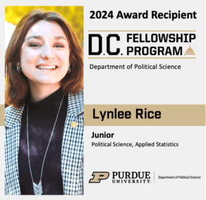 Lynlee Rice from West Lafayette, Indiana, is a junior majoring in political science and applied statistics. After a successful summer internship, she was named to a continuing position in Indiana State Party data organization for the fall municipal election cycle. On campus, Lynlee is a Senator in the Purdue Student Government representing the John Martinson Honors College, where she writes legislation to advocate for student concerns. Lynlee is also a mentor and team lead for undergraduate students as part of the Honors Mentor Program and serves as a research assistant in Purdue’s Computational Social Science Lab. Additionally, she is a dedicated member of the Purduettes vocal ensemble, where she leads a team as the Gold of Performance Preparation. Lynlee is thrilled to take part in the upcoming Boilers Go to D.C. Summer Scholars Internship Program.