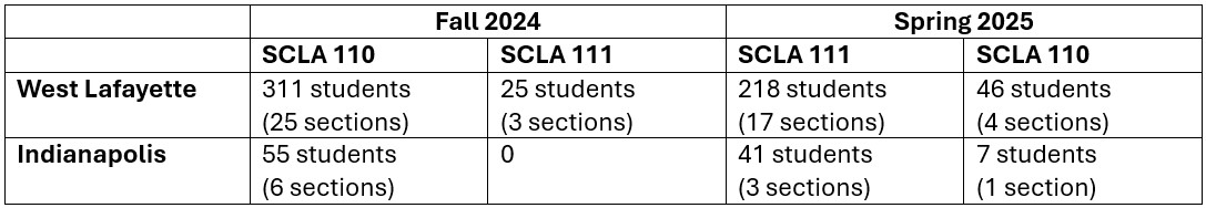 In Academic Year 2024–25, PLaCE enrolled a total of 419 students in 36 sections of SCLA 110 and 284 students in 23 sections of SCLA 111, across West Lafayette and Indianapolis. Fall 2024 marked the first semester that PLaCE had offered SCLA 110 at Indianapolis.