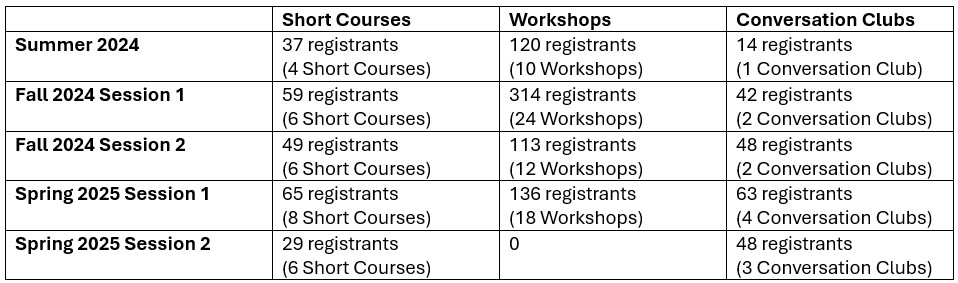 The total number of registrations across the year was 1137, including 239 registrations for 30 Short Courses, 683 registrations for 64 Workshops, and 215 registrations for 12 Conversation Clubs. The Short Courses and Workshops were offered in a mix of online and in-person formats, whereas the Conversation Clubs were conducted entirely in-person.