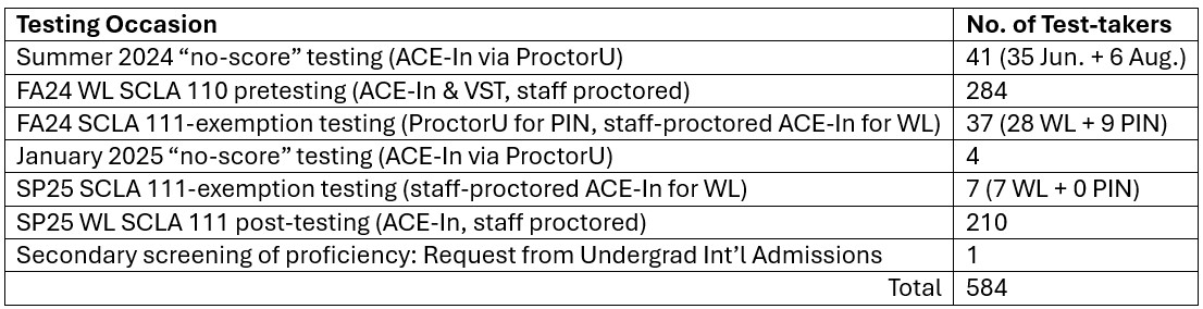 From June 2024 to April 2025, we administered a total of 584 ACE-In tests, including one test to accommodate a pre-admissions candidate as per request from the Undergraduate International Admissions Office. PLaCE staff also proctored 284 VST tests. The ACE-In is our locally developed and locally rated internet-based academic English proficiency test, whereas the VST is a publicly available internet-based test on receptive vocabulary knowledge.