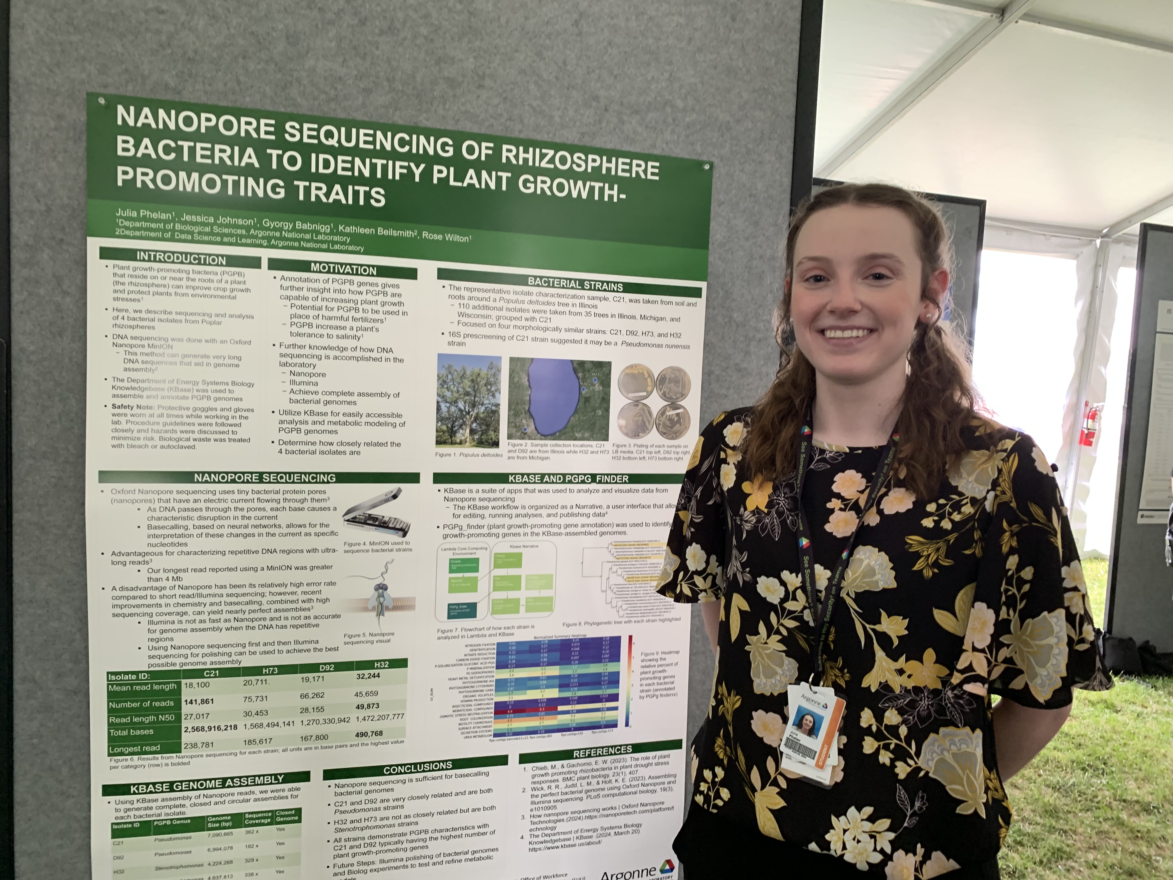 Julia Phelan had an internship at Argonne National Lab this summer. Julia was able to determine the relatedness of four uncharacterized bacterial isolates, as well as confirm that they are plant growth-promoting bacteria, by using Oxford Nanopore sequencing. Analysis of the data was done using KBase, the Department of Energy's Systems Biology Knowledgebase. Here is a link to the published KBase narrative (account required).