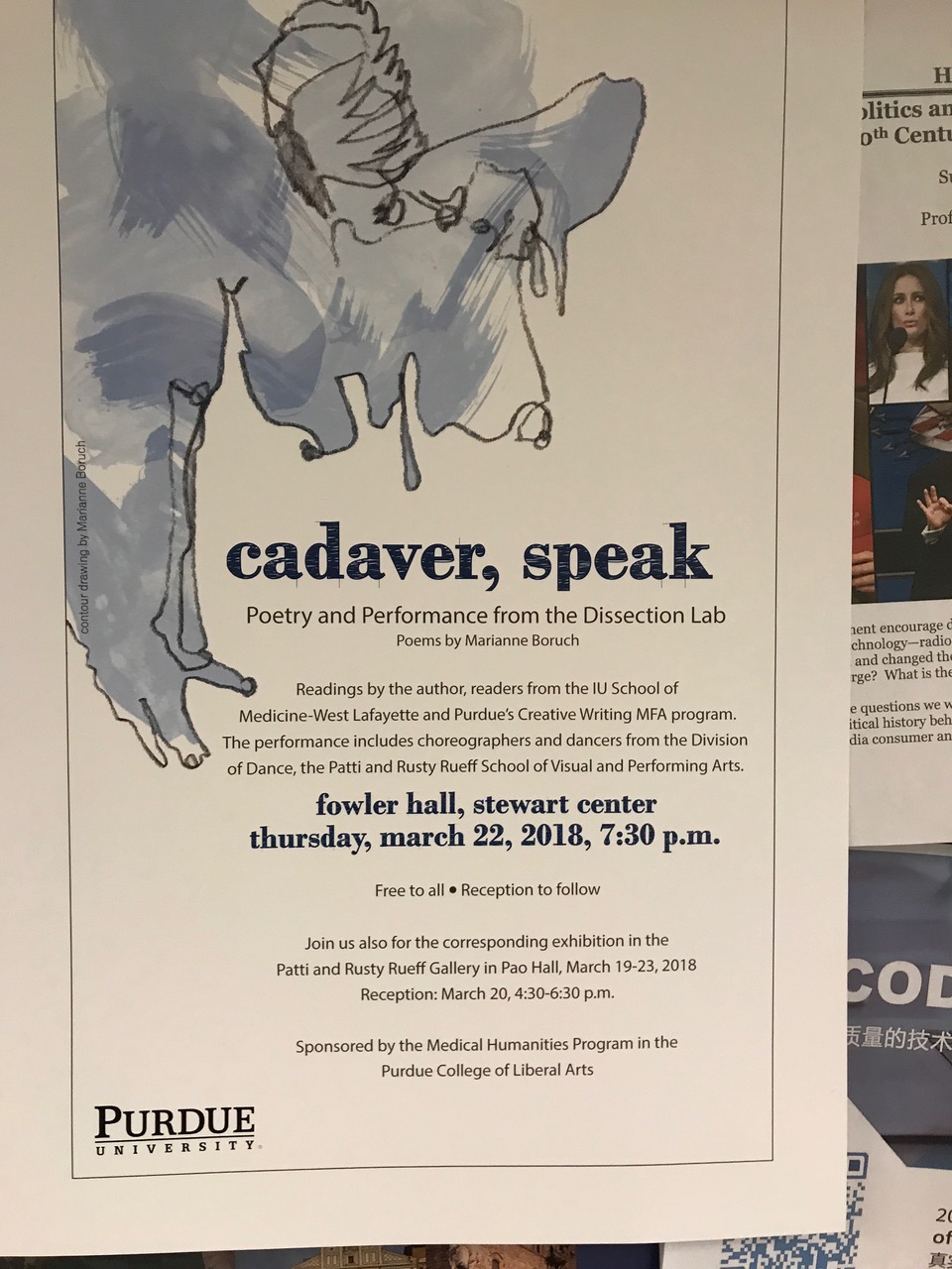 As outlined in the flier, "Cadaver, Speak: Poetry and Performance from the Dissection Lab" included readings by the author, Marianne Brouch, the IU School of Medicine (West Lafayette), and Purdue's Creative Writing MFA program.