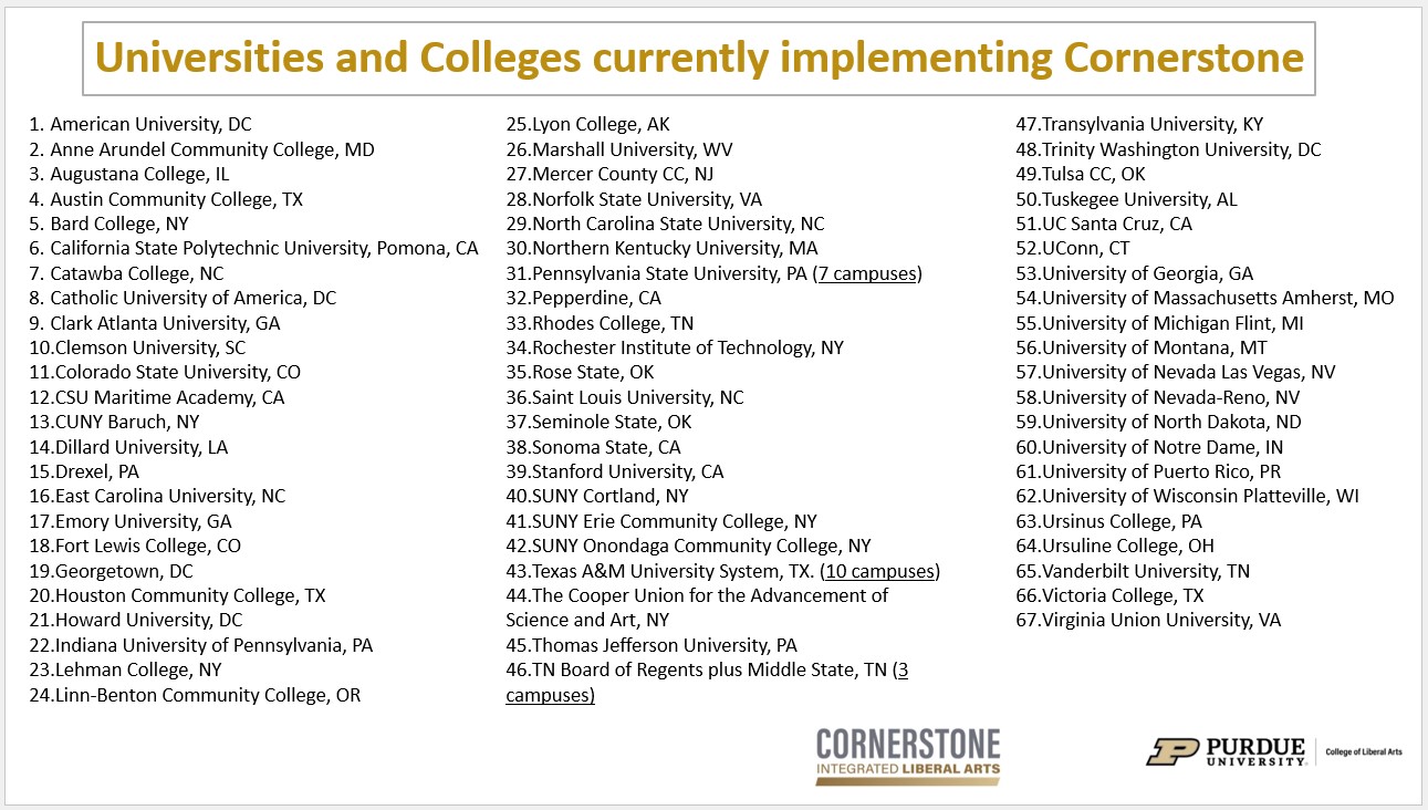 In September of 2020 the Cornerstone Integrated Liberal Arts program was recognized as the inspiration for a partnership between the National Endowment for the Humanities and the Teagle Foundation. Together, they will sponsor Cornerstone: Learning for Living, a grant program to reinvigorate the role of the humanities in general education across the country. NEH and the Teagle foundation have committed a minimum of $7 million to the project. The Cornerstone: Learning for Living initiative is designed, through general education, to provide all students with the opportunity to broaden their understanding of the world and themselves, while strengthening the skills to read closely, write clearly, speak with confidence, and to engage with differing viewpoints and perspectives—all capacities cultivated by the humanities that are crucial for participation in our democracy.