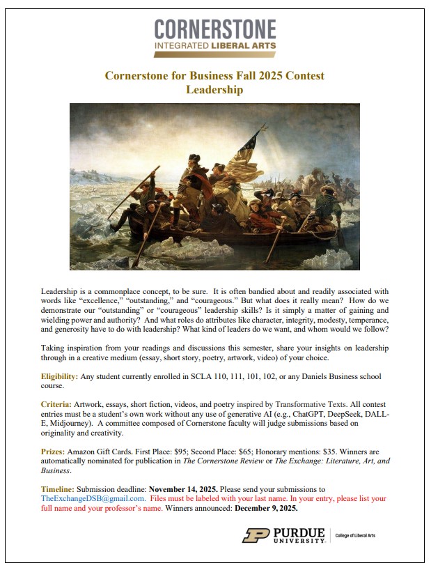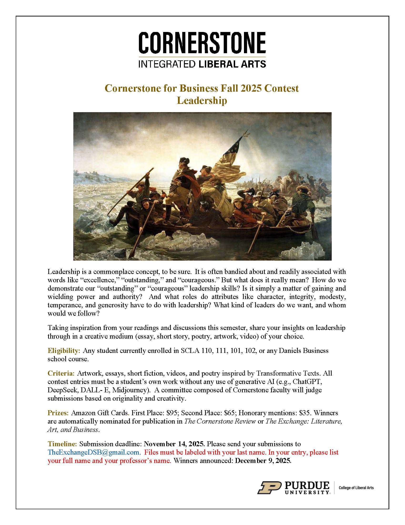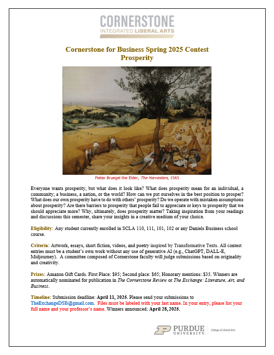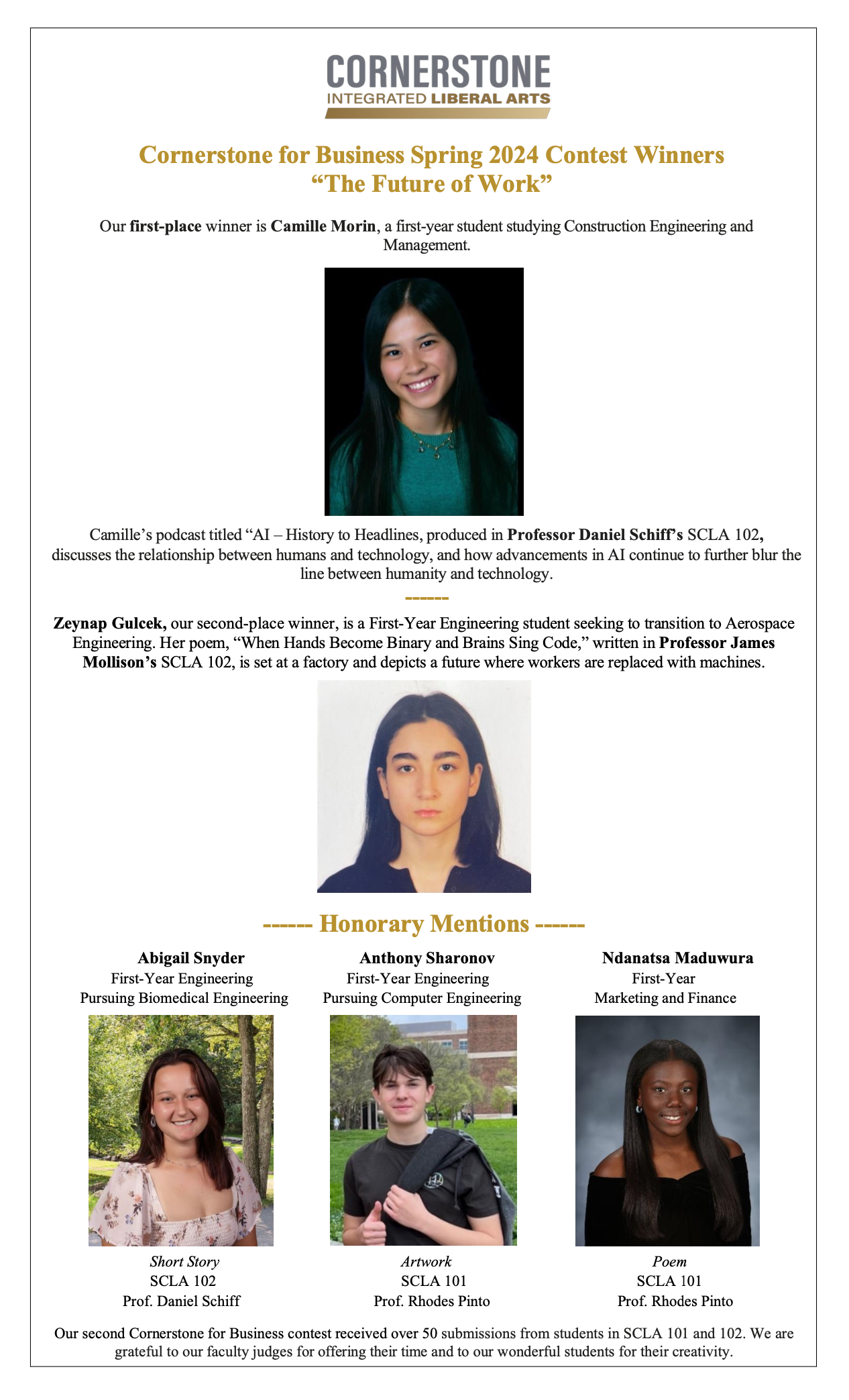 Timeline: Submission deadline: April 1st, 2024. Please send your submissions to cornerstonecontest@outlook.com. All files must be labeled with your last name. In your entry, please list your full name and your professor’s name. Winners announced: April 17th, 2024