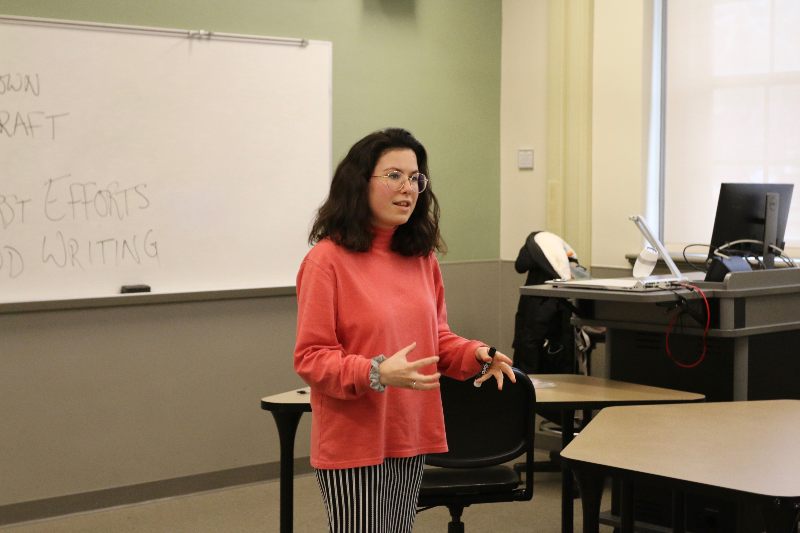 With ICaP’s newly implemented common assignment, the portfolio, ICaP was interested in how various instructors teach to our standards and how they incorporate their own flavor. Kate’s interests in writing center work, creative writing, and collapsing the binary between academic and creative writing proved to be powerful experiences that allowed her to create a classroom community enveloped in reflection, which is core to the portfolio and much of composition pedagogy. According to Kate, the French word essai best speaks to her classroom pedagogy because it means “to try” or “test.” “Maybe this thing will work, maybe it won’t,” states Kate.