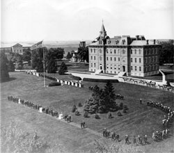 "University Hall is the only building remaining of the original six-building Purdue campus. Construction of 'The Main Building,' its original name, was begun in 1871 where Smith Hall presently stands. This work was halted when the university purchased land north of State Street, and the final construction was started in the Fall of 1874, about the time of the first students' arrival. The cost to complete the building was $35,000, and it was dedicated in November of 1877. It was used as a classroom and the University's first library. It also held the chapel and the president's office until Fowler Hall was built in 1904. University Hall was remodeled in 1961. John Purdue requested that he be buried in front of University Hall, and his grave directly east of the building still serves as a monument to him and the university he loved."