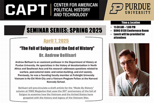 Dr. Andrew Bellisari is an assistant professor in the Department of History at Purdue University. He specializes in the history of decolonization in North Africa and Southeast Asia and his research addresses questions related to warfare, post-colonial state- and nation-building, and civil society. Previously, he was a founding faculty member at Fulbright University Vietnam in Ho Chi Minh City and a Vietnam Program Fellow at the Harvard Kennedy School.