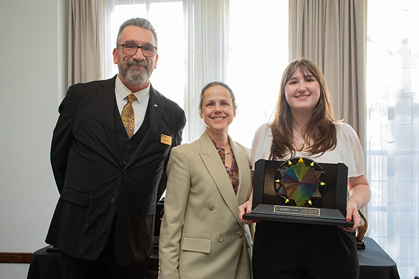 Grace Evanoski (right), pictured with Executive Associate Dean Joel Ebarb and Department of History Director of Undergraduate Studies Yvonne Pitts.