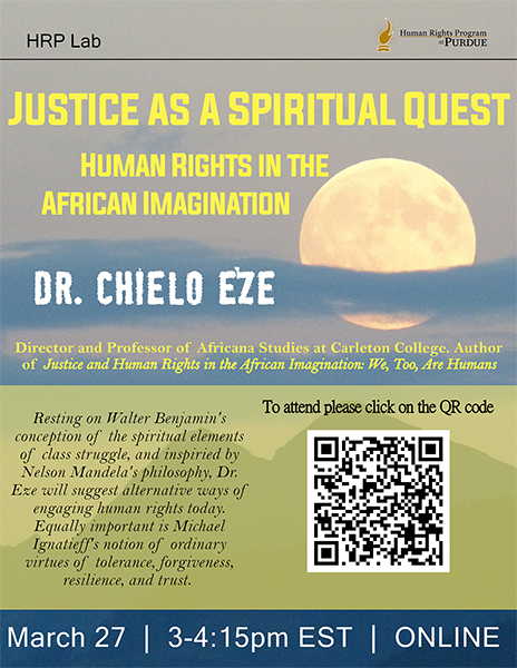 The Human Rights Lab welcomes Dr. Chielo Eze (PhD from Purdue University; MFA). Dr. Eze will present, “Justice as a Spiritual Quest: Human Rights in the African Imagination” on Thursday , March 27th, at 3pm on Zoom.