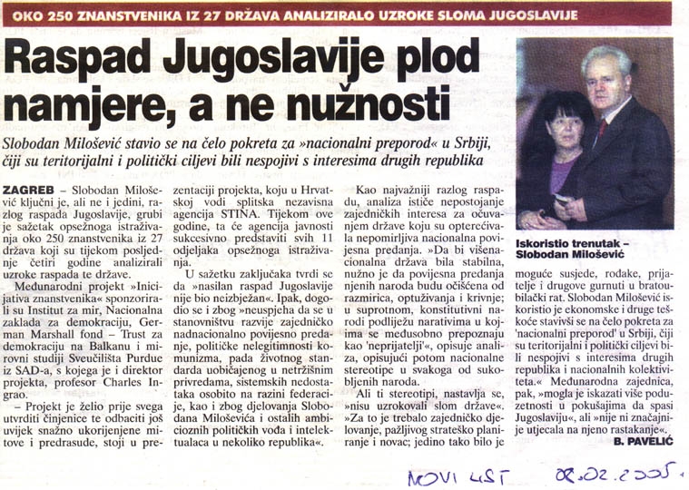 Raspad Jugoslavije plod namjere, a ne nužnosti - Novi List, 08.02.2005