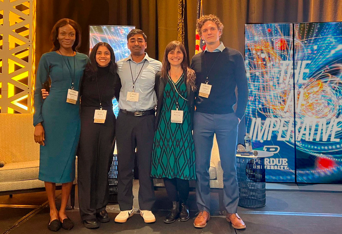 Pictured are Purdue graduate students Ogadinma Enwereazu, Hanna Sistek, and colleagues. Ms. Enwereazu is a member of the Governance & Responsible AI (GRAIL) lab at Purdue.
