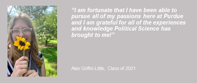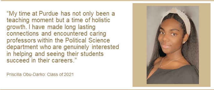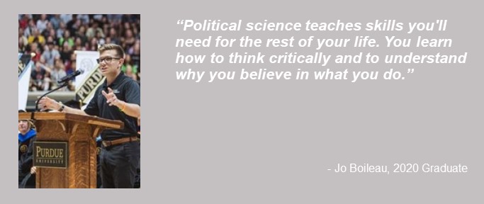 Purdue Political Science students come many different backgrounds to pursue many different goals. Political Science offers an innovative mix of classes and learning experiences for a personalized set of steps to pursue individual goals.