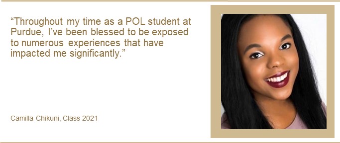 Political Science and History double-major Camilla Chikuni will be graduating from Purdue University in May. The Weston, Connecticut native describes her experiences at Purdue as “fun, extremely enlightening, educational, engaging, and informative.” Click to learn more.
