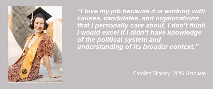 Caroline Shanley’s position as a Digital Strategist in Washington, D.C. is the ideal job for the 2019 graduate. With a double major in political science and public relations, her interdisciplinary degree gave her a competitive edge to jump start her career. Click to learn more.
