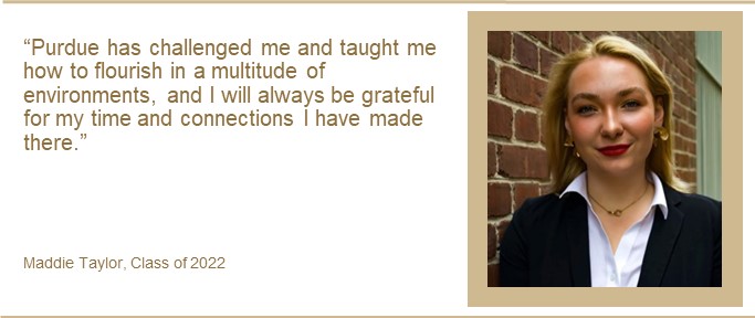 During her time at Purdue, Taylor has had the opportunity of meeting with individuals at the highest level of the federal government. She has also interacted with leading journalists at Axios, C-SPAN, MSNBC, and The Washington Post. Click to learn more.