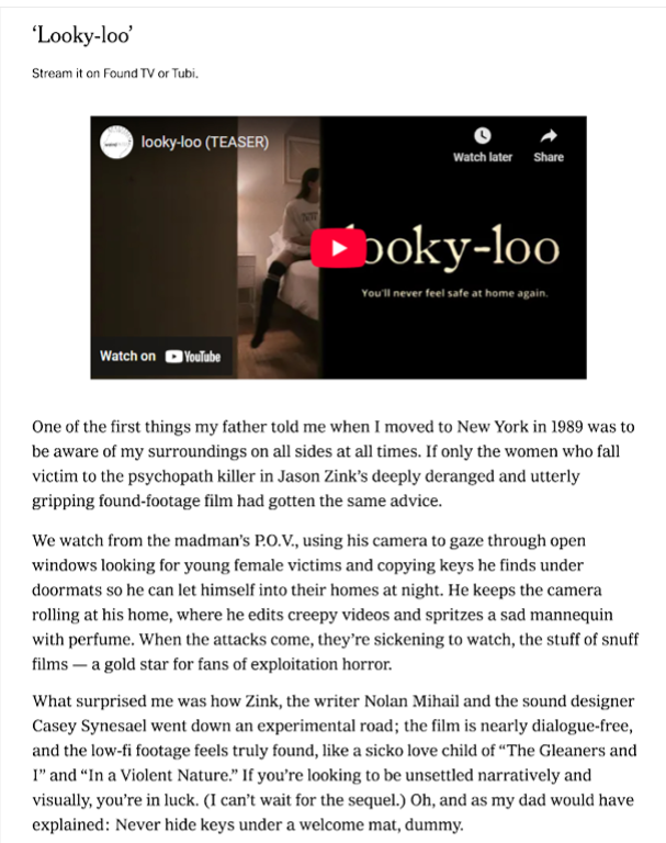 CONGRATULATIONS JASON ZINK, (Limited Term Lecturer, Department of Film & Video) and his crew at Weird on Top Pictures, on receiving a glowing review of 'Looky-loo' from the New York Times! The review is featured in Erik Piepenburg's 9/12/2025 article "Five Horror Movies to Stream Now".