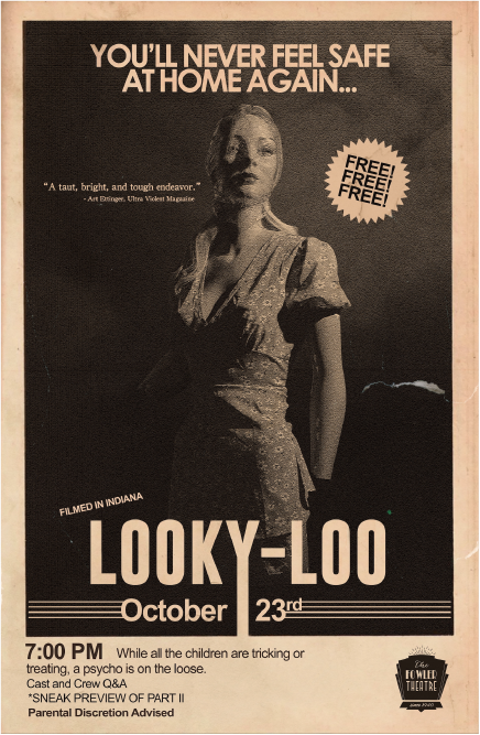 Come out on Thursday, OCTOBER 23rd @ 7PM to the Fowler Theatre (in Fowler, IN - 30 minutes from campus) in support for the big screen presentation of 'Looky-Loo'. This film was created by Film & Video's Jason Zink