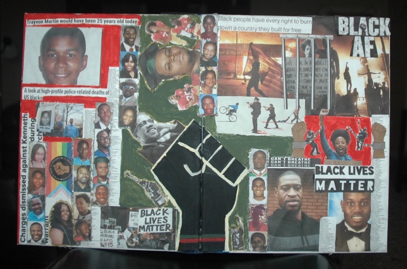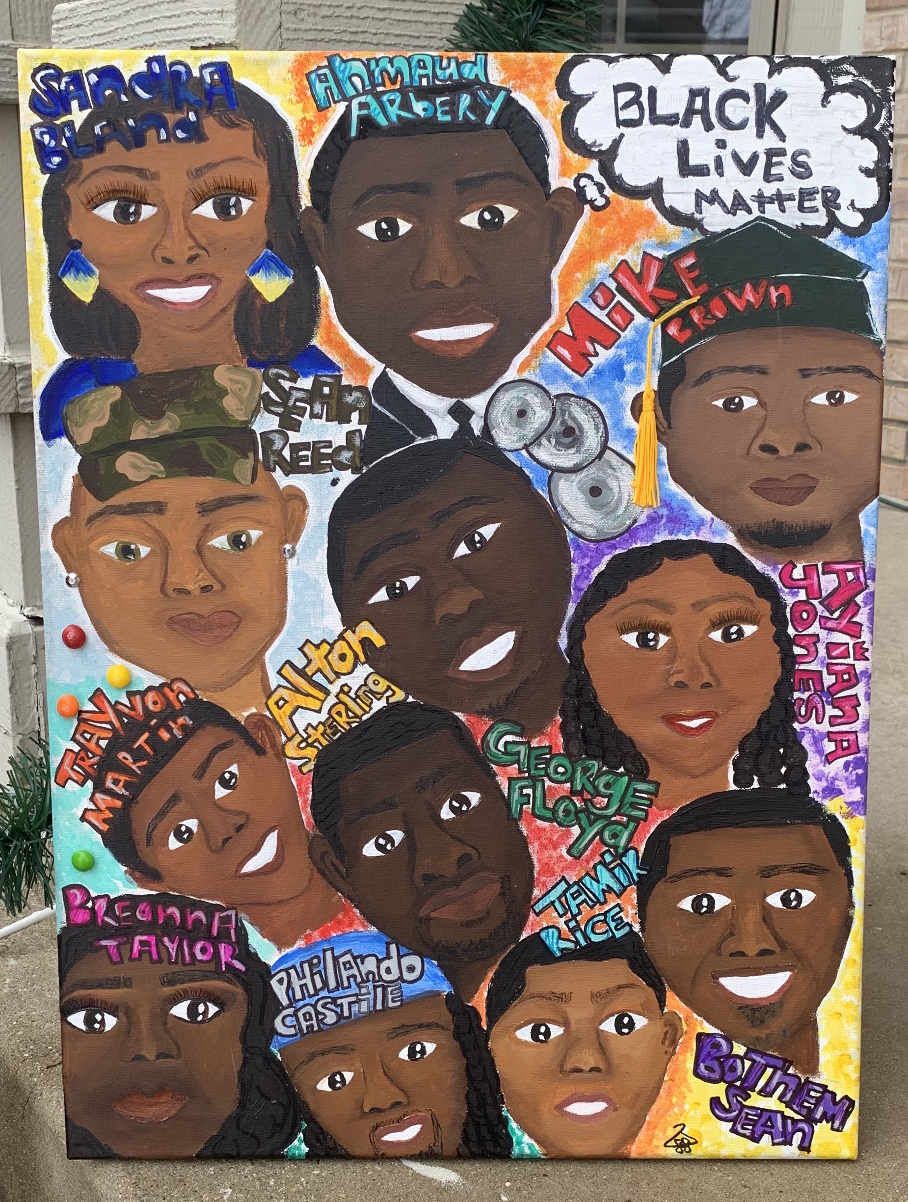 This piece was made during the protests that took place all over the nation as the Black Lives Matter Movement took a turn. After the unlawful killings of George Floyd and Breonna Taylor, I took to one of the ways to best release the hurt I felt after these tragic events. There are many different elements to this piece as it highlights the many lives of African American men, women, and children whose lives were lost; snippets of some of the protest that took place, and at the center, the symbol for Black Power. Each section outlines the magnitude of the Black Lives Matter Movement and how it must move forward. Justice is something that is not present when it comes to African Americans. The color of our skin has divided us for so long and whenever we try to use our voices they are disregarded. This piece evokes the power of the Black Voice being heard over and over again, but still no one listening.