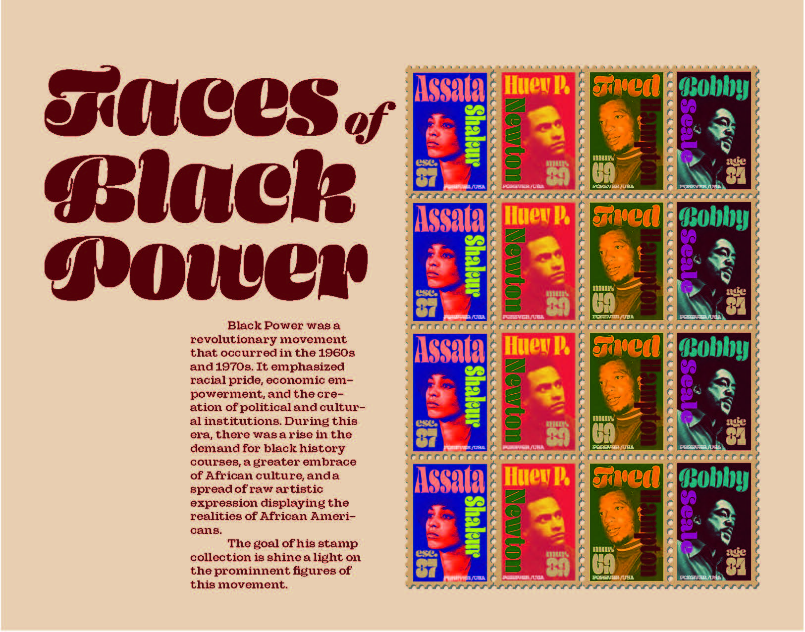 USPS Postage stamps are pieces of Americana inspiring visions of patriotism and apple pie. These are the same visions invoked with the chanting of “Make America Great Again.” “Faces of Black Power” is a collection of postage stamps inspired by the history of Black freedom fighters, rather than the whitewashed history and vision of early America often portrayed.