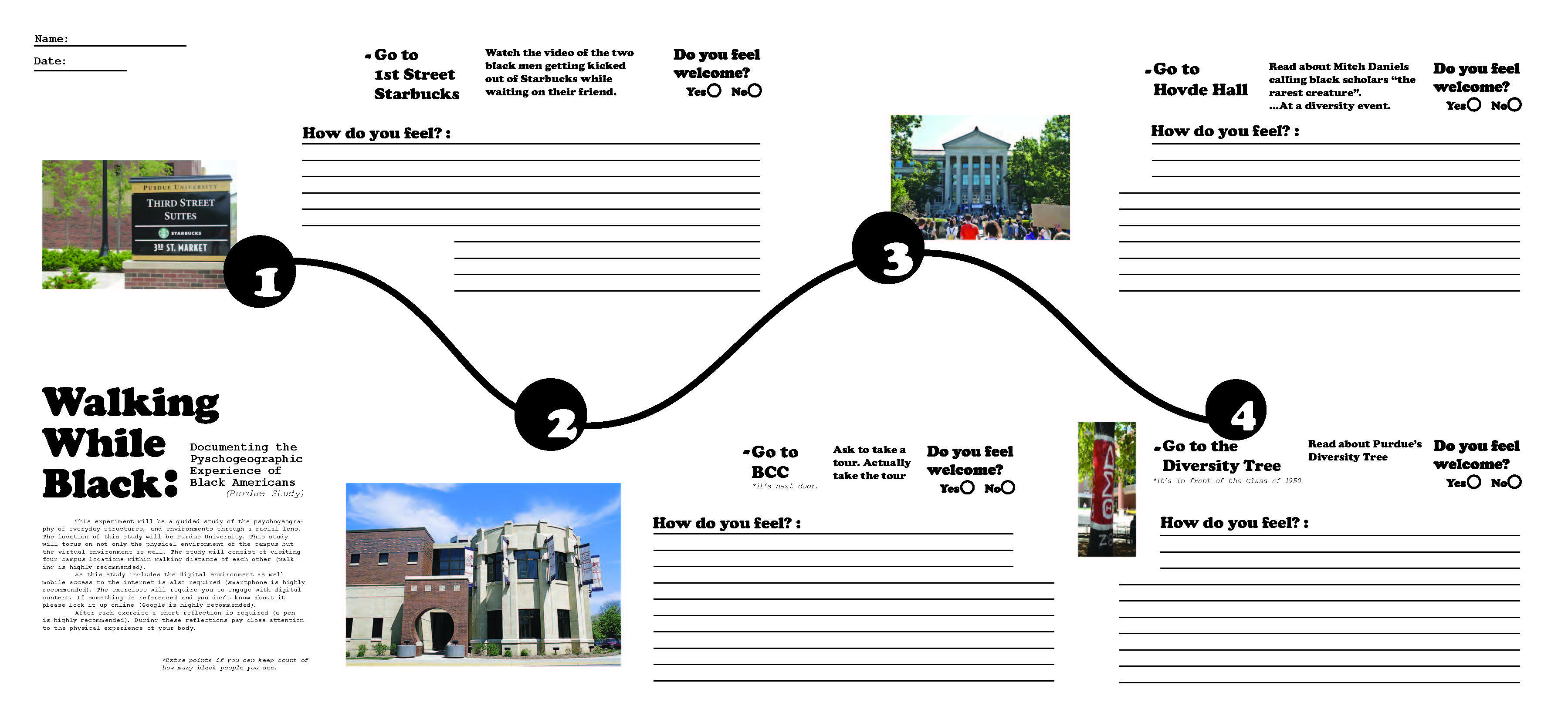 Psychogeography, coined by Marxist theorist Guy Debord in 1955, describes the effect of a geographical location on the emotions and behavior of individuals. Psychogeography often explores the urban environments with an emphasizes on playfulness and "drifting”. “Walking While Black” is a guided personal reflection on the individuals comfort level within an urban environment, specifically Purdue.