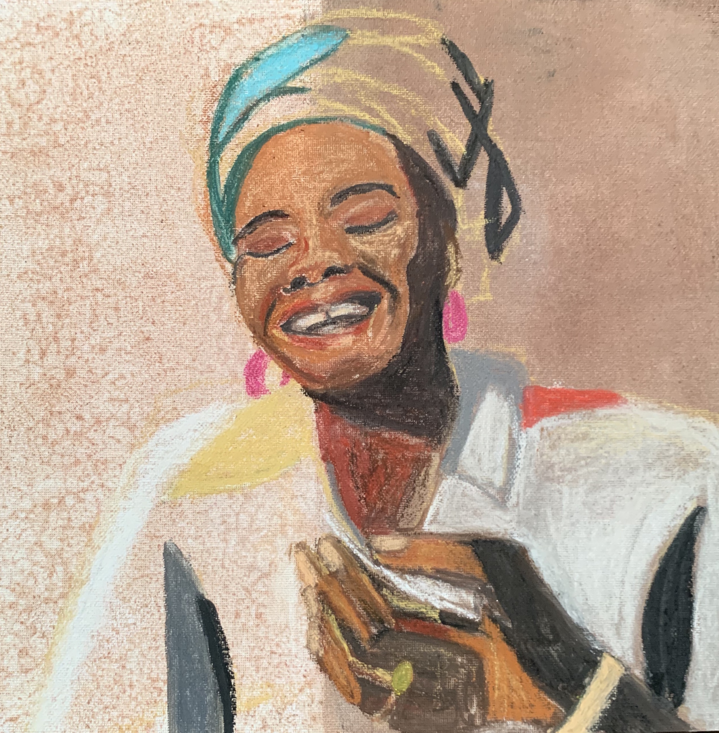 During the search for racial justice, I have pursued stories of black people through the famous words of Maya Angelou. Listening to Maya read her poems pushed me to create this lively portrait of her.