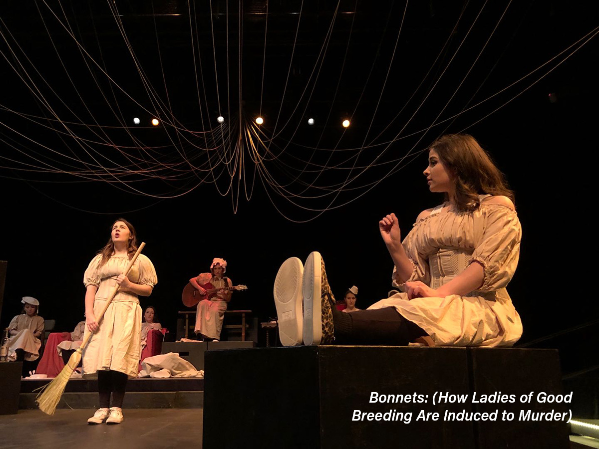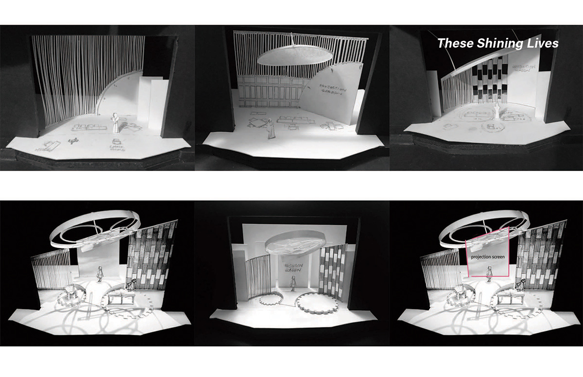 For her terminal project, These Shining Lives, Max abstracted central themes in the play to create a visually striking landscape for the powerful true story of women who worked in a watch factory in Ottawa, IL in the 1920s, and who became ill from their exposure to radium. Vertical strings lined the back of the stage, connecting dials of various sizes above and below. The set effectively conveyed both the strength of the women in solidarity, the poignancy of friendship in their lives cut short.