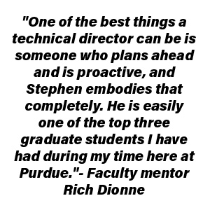 During his very first semester at Purdue, Stephen was presented with the challenge of creating snow for a production of The Mousetrap. He created a mechanism in which a snow drum, hung above the stage, was powered by a bicycle, operated offstage – and ever since then, he has been leading the way in technical direction at Purdue.