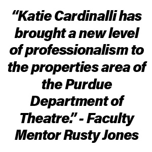 Kate has been very busy at Purdue, working on every main stage production mounted in theDepartment of Theatre over her three years. She served as the scenic designer for three Purdue mainstage productions:Mother Courage and Her Children, In the Blood, and Miss Bennet: Christmas at Pemberley. As the assistant scenic and dragon designer for She Kills Monsters, her work on Tiamat the dragon was not only visually captivating, but laid the foundation for theatre engineering undergraduate seniors’ capstoneprojects. Kate’s appreciation for the minutiae of design makes her an excellent head of properties, serving as such at Purdue for Angels in America, Part One: Millennium Approaches, Nell Gwynn, These Shining Lives, The Two Gentlemen of Verona, and By the Way, Meet Vera Stark. Additionally, she was a scenic artist for Next to Normal. In the summer of 2019, Kate worked as a props artisan at Santa Cruz Shakespeare.