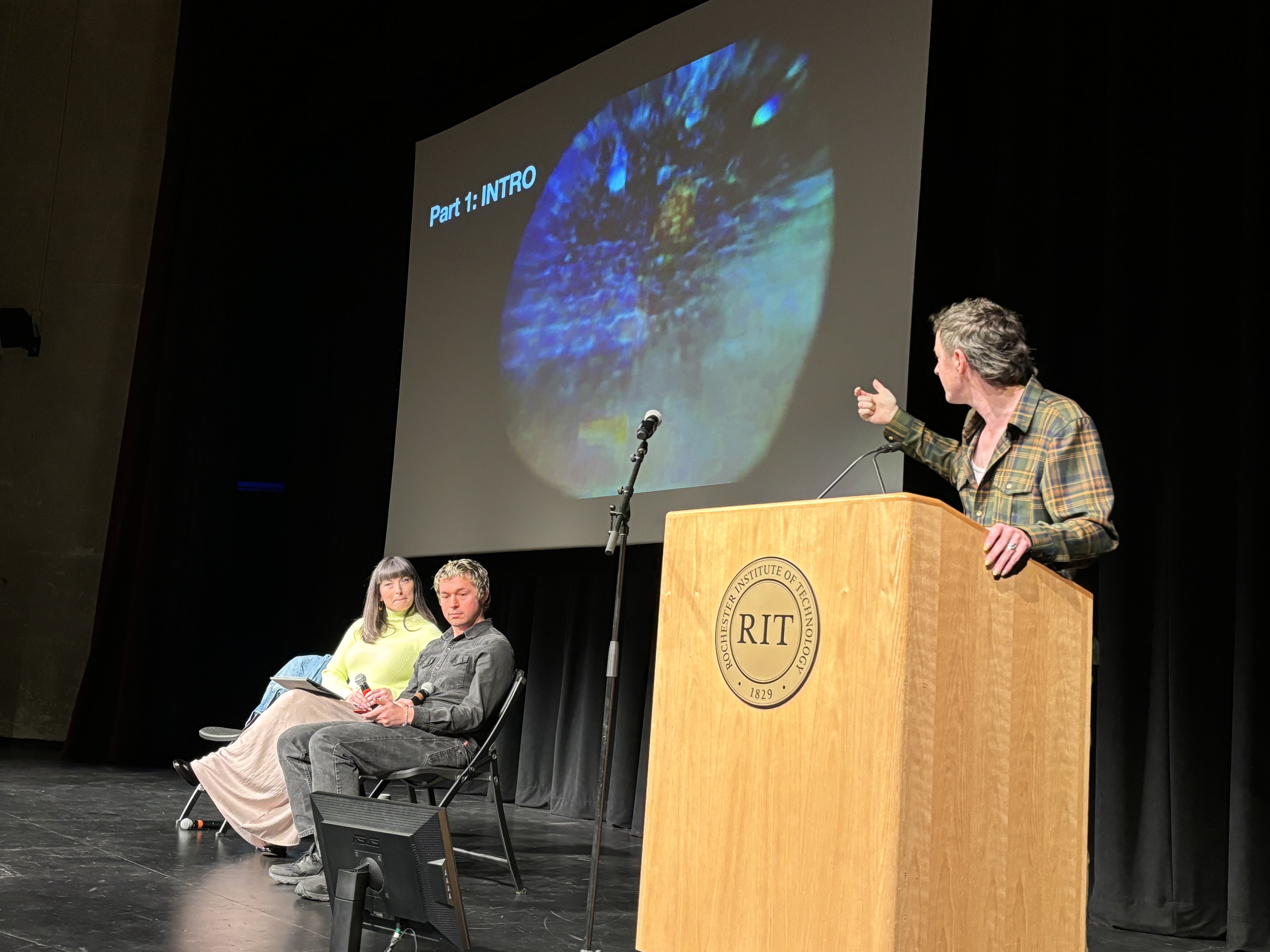 On November 15, 2024, Kathleen Hickey, Dance Lecturer, along with her collaborators Rory Willats, an independent director, devisor, and creative technologist, and Nicki Duval, a Visiting Assistant Professor at Colgate University in Film and Media Studies, presented a lecture/panel discussion at the 2024 a2ru conference, “Generate | Integrate” at the Rochester Institute of Technology. This three-day conference included some 20 panelists in 10 sessions focused on technology, the arts, and design. Hickey, Willats, and Duval presented reflections and lessons learned from their 2023 collaboration, The Embellished Gesture (Virtual or Not), a dance work featuring four dancers navigating online masculinities through choreographic exploration using VR, motion tracking technology, and live film projection that premiered at the University of California Santa Cruz.