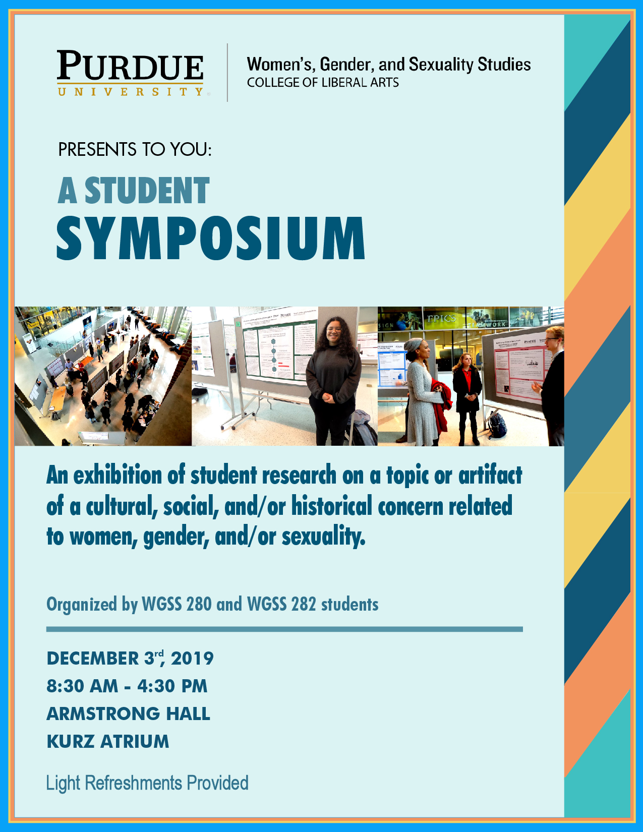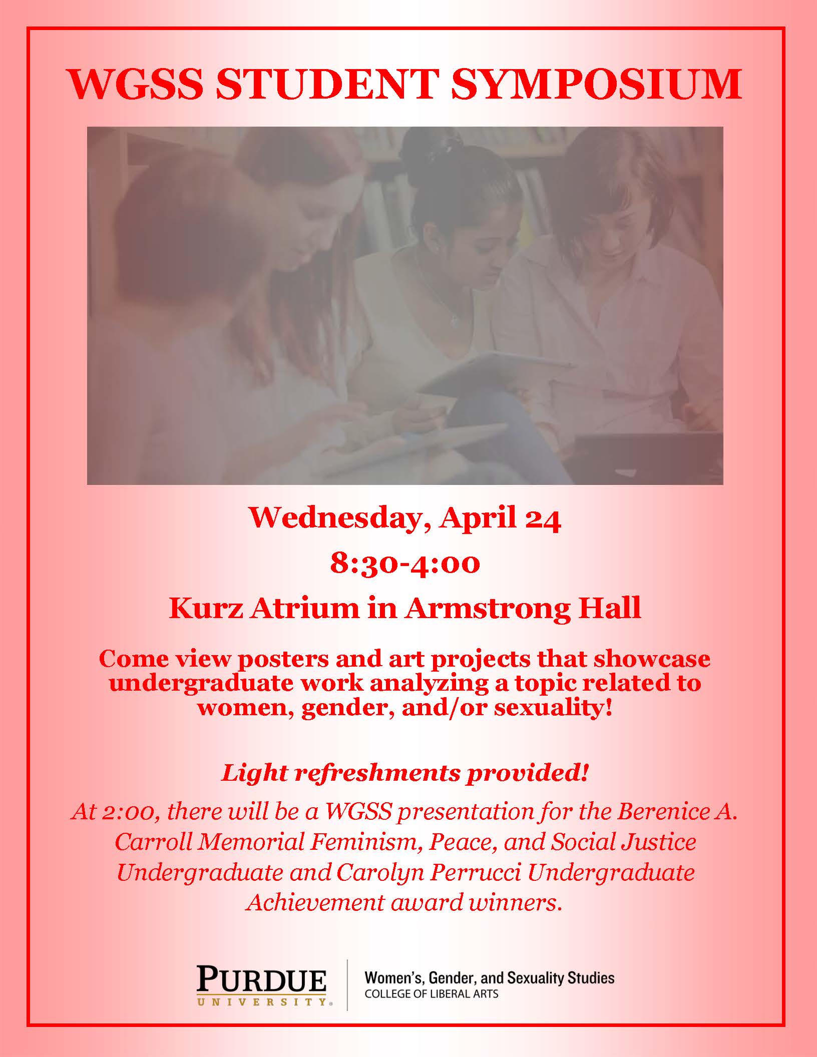 - WGSS Symposium - stop in to the Kurz Atrium in Armstrong Hall to see our student's exhibitions on topics or artifacts of a cultural, social, and/or historical concern related to women, gender, and/or sexuality