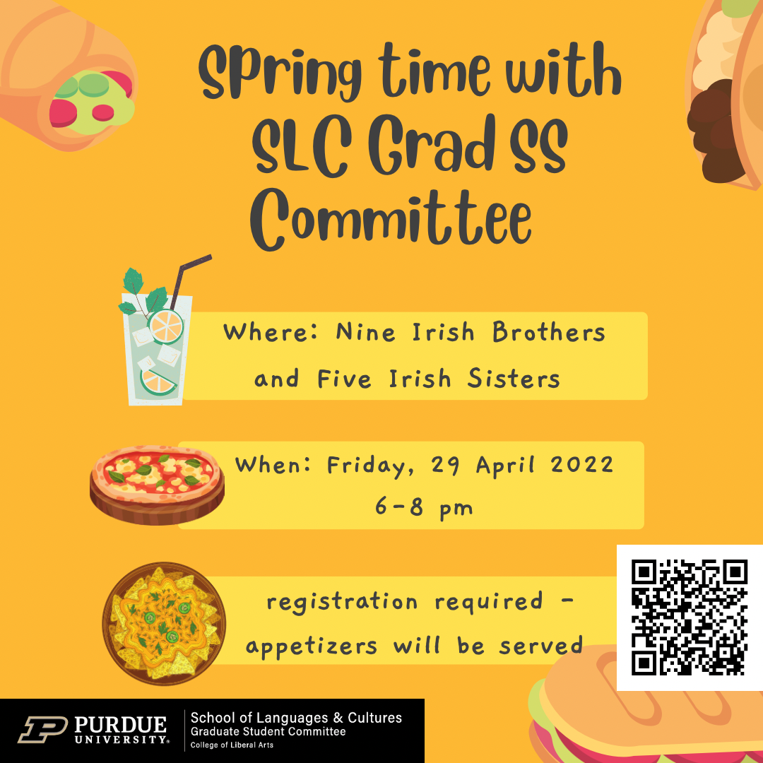 Upcoming Events Social Event Spring 2022: "Spring Time with SLC Grads Committee!" Where: Nine Irish Brothers and Five Irish Sisters, West Lafayette When: Friday, April 29th Time: 6:00-8:00 pm Registration required: Please RSVP here.