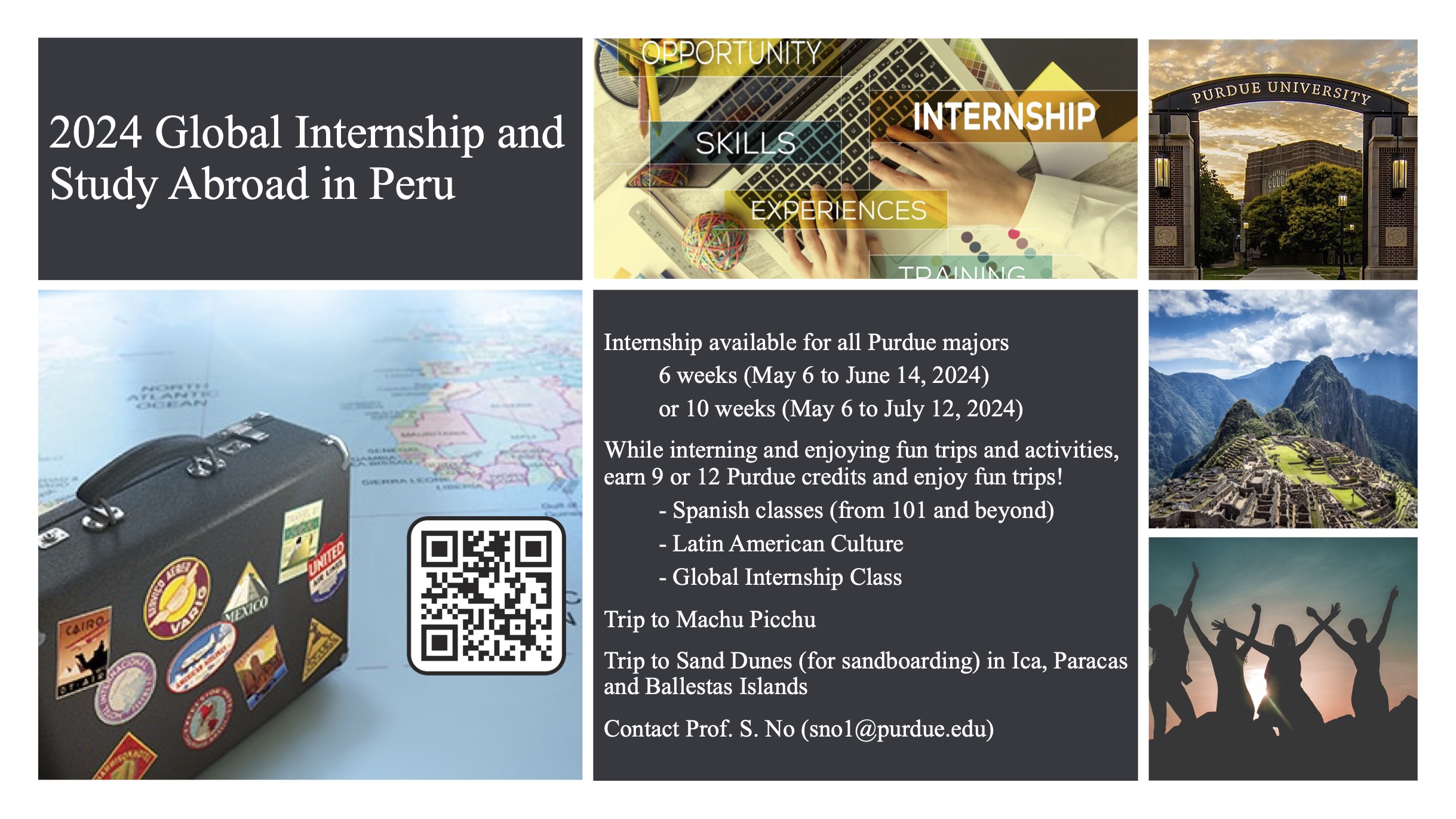 The Summer Global Internship and Study Abroad in Lima-Peru study abroad offers two options: a five-week immersion program of language and culture studies; or an eleven-week immersion program with a global internship experience. With the five-week program, students will take two courses (6 credit hours): SPAN language class (100, 200, and more) and LALS 25000 (Latin American Culture). Students enrolled in the global internship experience and study abroad will take 3 courses (9 credit hours): SPAN language class, LALS 2500, and IDIS 49000. Credits count towards the Spanish major and minors as well as the Latin American and Latino Studies minor. This program is an ideal opportunity for students who want to learn professional or business practices related to their major and improve their language skills. Students will travel to Machu Picchu and Cuzco while learning about Latin American history and cultures. For more information, visit the Study Abroad website.
