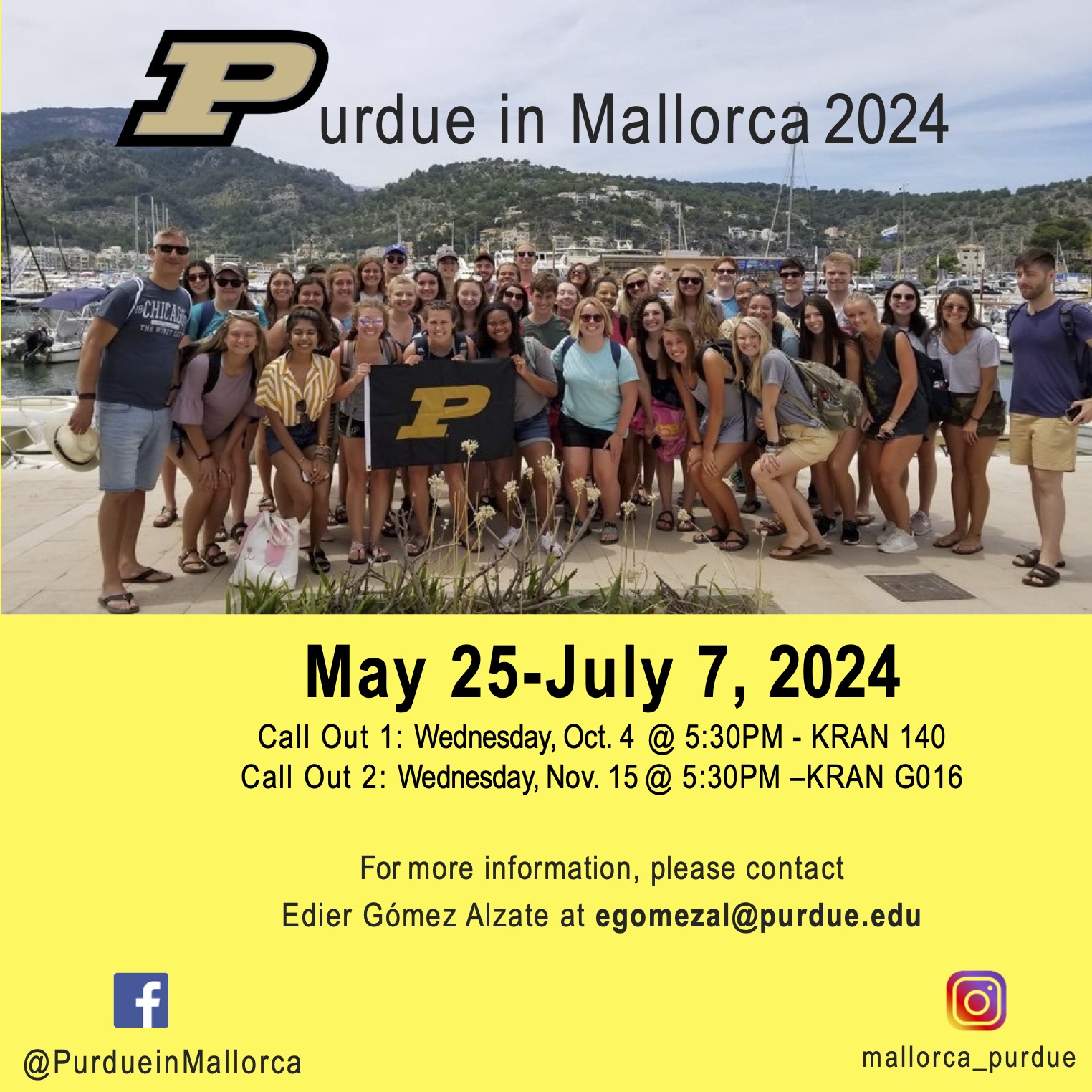 The Summer Study Abroad program in Palma de Mallorca is a six-week immersion program that takes place at the Universidad de las Islas Baleares (UIB). The university and the Center for the Study of the Spanish Language have a well-known international reputation in the teaching of Spanish as a Second Language and are accredited by the Cervantes Institute. Students will stay with Spanish families in Palma de Mallorca and will be immersed in Spanish culture and language via language and content courses, excursions, and other extracurricular activities. Participants will enroll in two courses (6 credits hours) from the following list: SPAN 301; SPAN 398 Spanish Politics and Society; or SPAN 398 Spanish Modernism. All courses are taught in Spanish by professors from Purdue and the UIB and they count for the Spanish major and minors. For more information, visit the Study Abroad website.