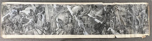 Through a serendipitous twist of fate, an old friend of Gotway’s, who knew that she’d recently accepted a position, notified her that a collection of Eugene Savage’s work was going up for auction through Schwenke Auctioneers in Woodbury, Connecticut on May 23, 2023. The auction included many of Savage’s sketches and watercolors previously held by the artist’s heirs after his 1978 death. The sketch measures an impressive 14.5 feet long by 3.5 feet wide, and across the image there is evidence of Savage adjusting the placement and appearance of many of the elements. Additional sheets of paper are pasted on the composition, demonstrating his artistic practice and technique. Purdue Galleries Luce curator Kirstin Gotway says, “This work will help future Boilermakers better understand how Savage conceived and designed the mural that has graced the wall of Stewart Center for more than half a century.”