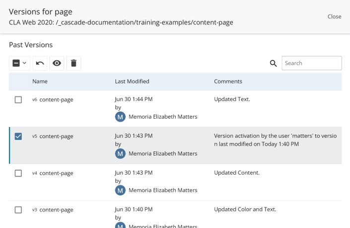 - Select the page and click Restore to restore it as the current version
