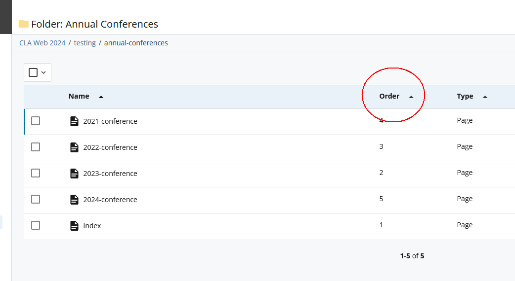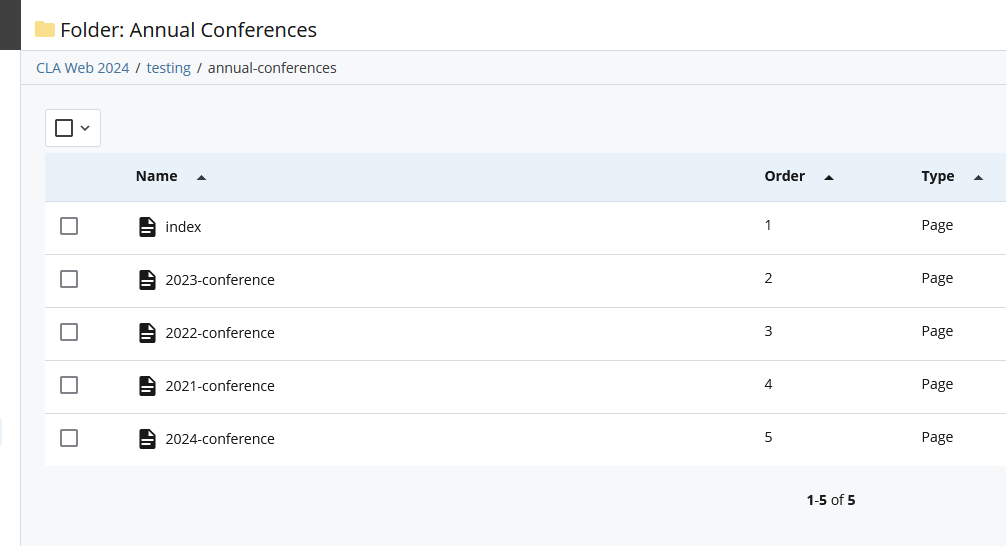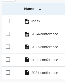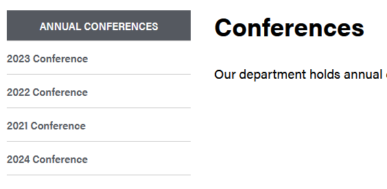 For example, let's say we have a folder for annual conferences. There's a landing page, and four other pages, one for the last four years. It looks quite normal, except you'll notice one problem, which is that 2024 is at the bottom of the menu, under 2021. We want to reorder the menu so that the most recent conference's page is at the top.