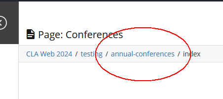 - In this case, the page we have open is the landing page, so its file name is "index", and the folder it's in is "annual-conferences", which is what you can click to open.
